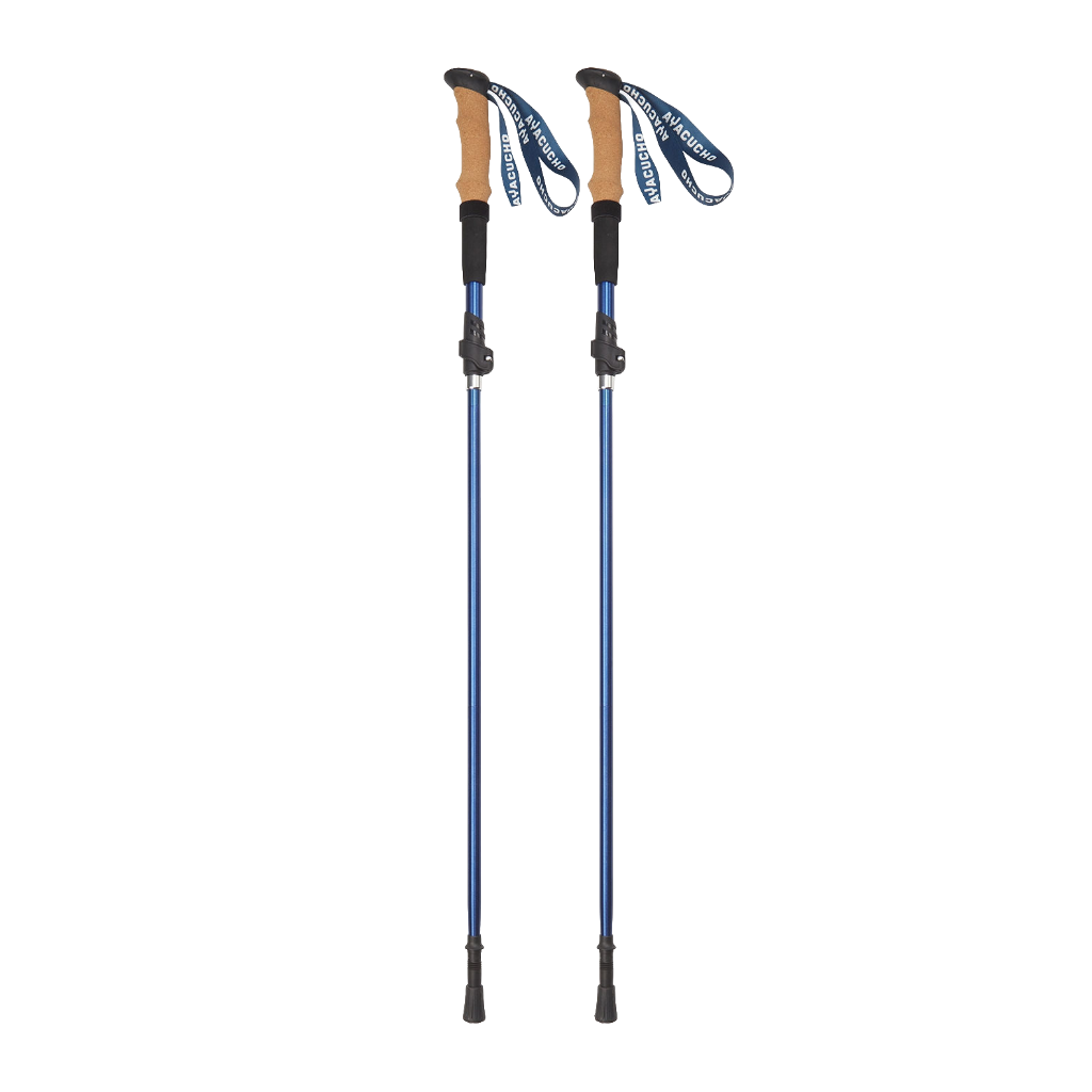 Twee beelden: Close-up van handen die blauwe trekkingstokken vasthouden met zichtbaar Ayacucho-logo, rechts twee wandelaars die trekkingstokken instellen bij een houten wegwijzer.