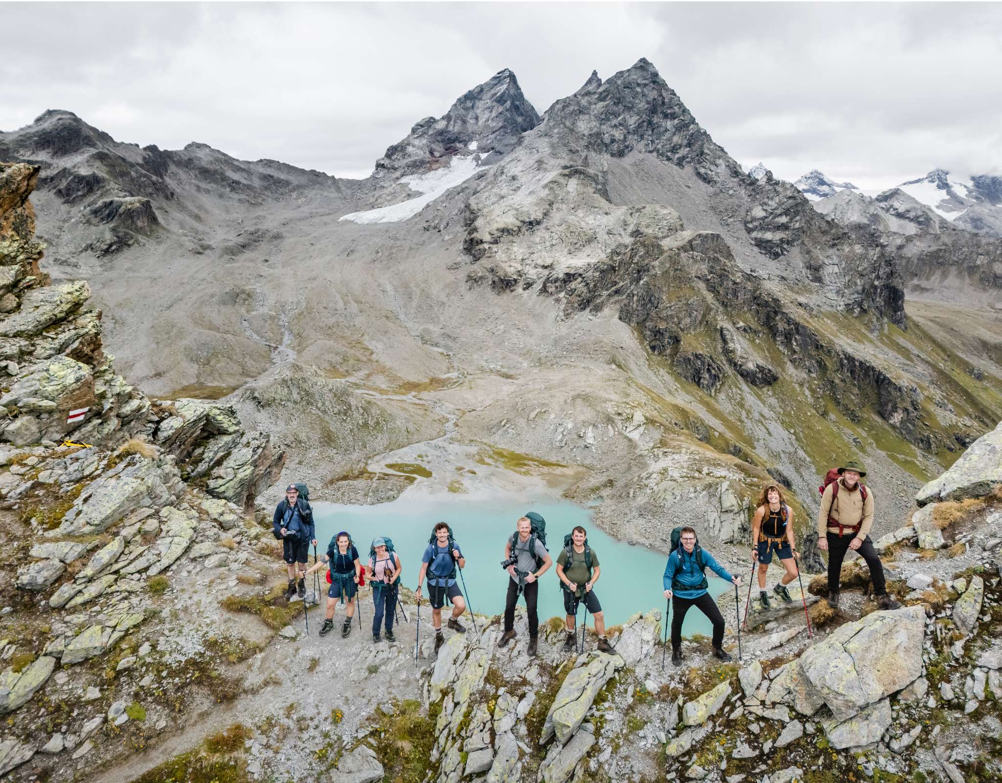 De helling wordt steeds steiler en het pad verandert in een wirwar van losse rotsblokken. Stap voor stap zoeken Simon en Senne hun weg omhoog, de stokken stevig geplant tussen de stenen. Boven op de bergkam worden ze beloond: een nieuwe vallei ontvouwt zich voor hun ogen, met een felblauw bergmeer dat schittert in de diepte.