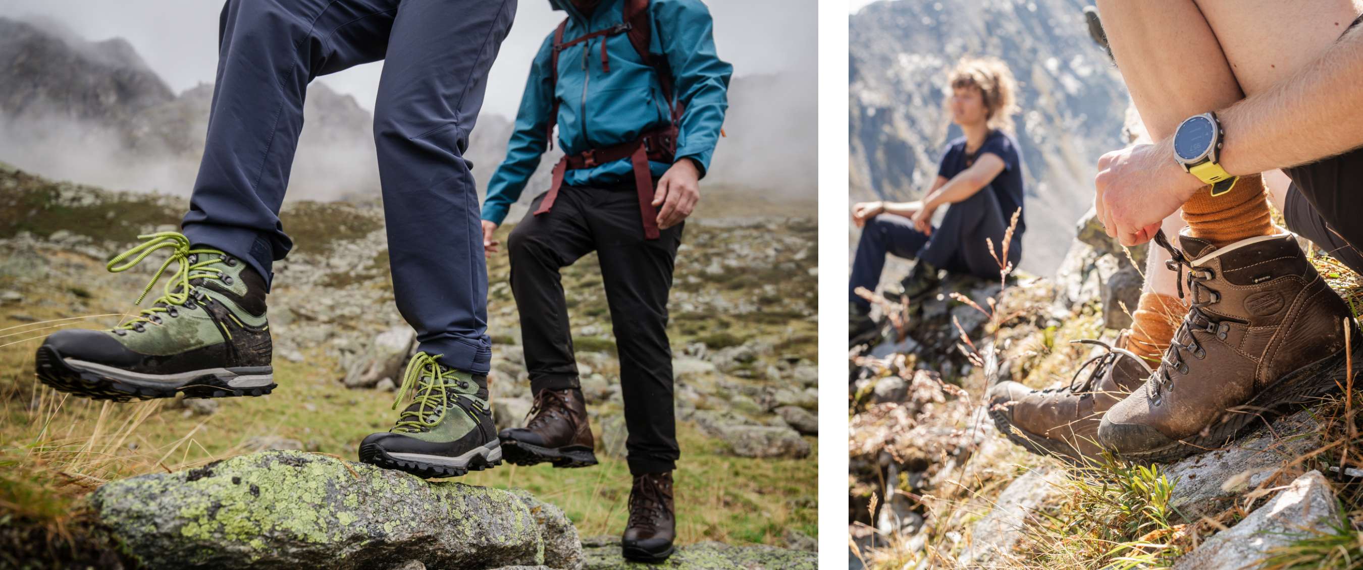 Ze klauteren over steile paden omhoog, richting een bergkam. Vinnig en vol vertrouwen stappen ze van rotsblok naar rotsblok. Het heeft geregend, de stenen zijn nog vochtig, maar dat deert hen niet. “De grip van de Vibram-zolen is verrassend stevig. Dat biedt zoveel stabiliteit en zekerheid”, vertelt Robin. “Ik ben geen enkele keer weggegleden.” Ook van omgeslagen voeten of valpartijen is geen sprake. Lore vult aan: “De schoenen voelen stevig en veilig. Zelfs bij losliggende stenen ben ik nooit bang geweest dat mijn tenen gevaar liepen.”En over stenen gesproken: “Op geen enkel moment zijn er steentjes in de zool blijven steken”, merkt Robin op. “Gelukkig, want niets vervelender dan steentjes uit je zolen te moeten peuteren.”